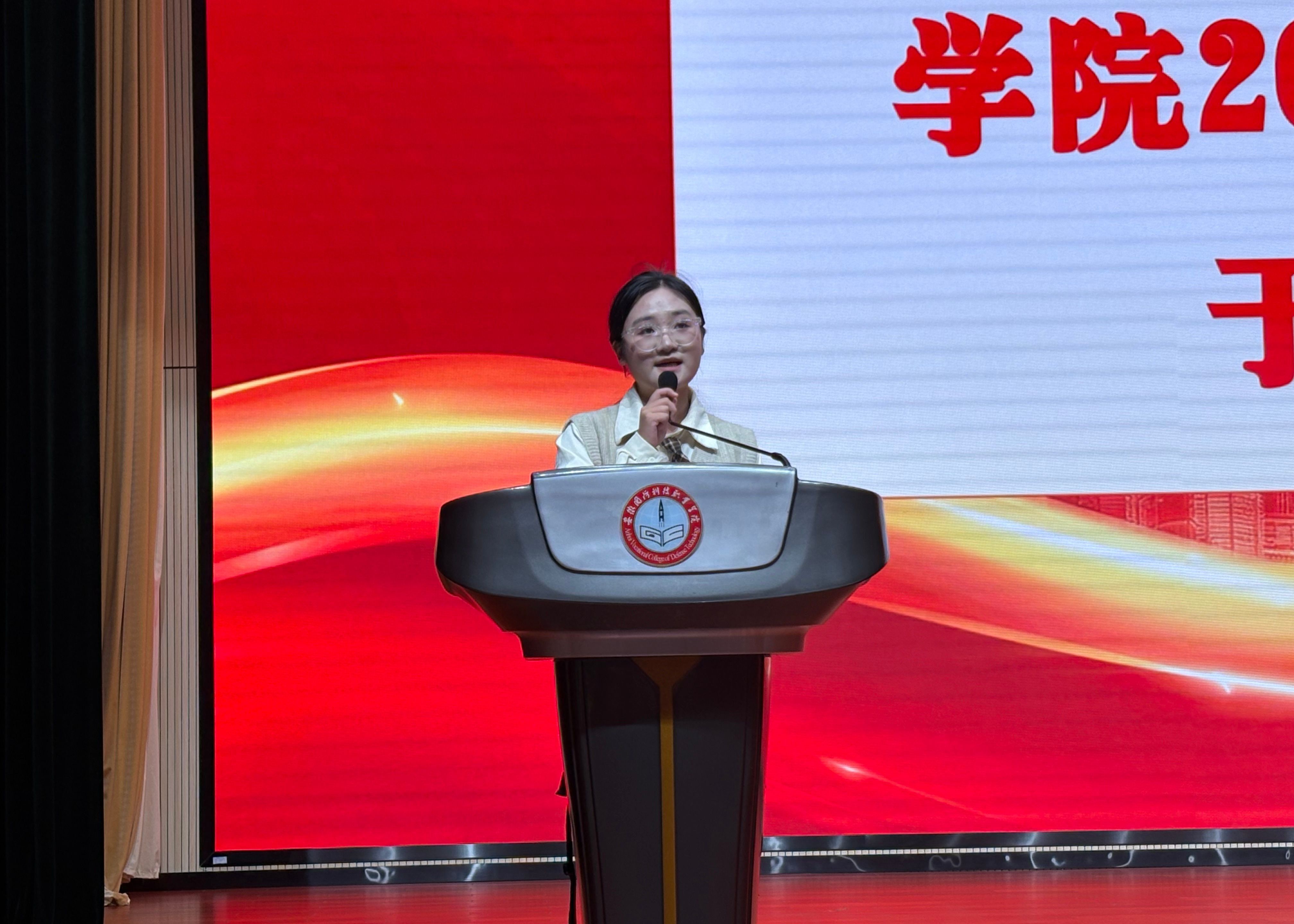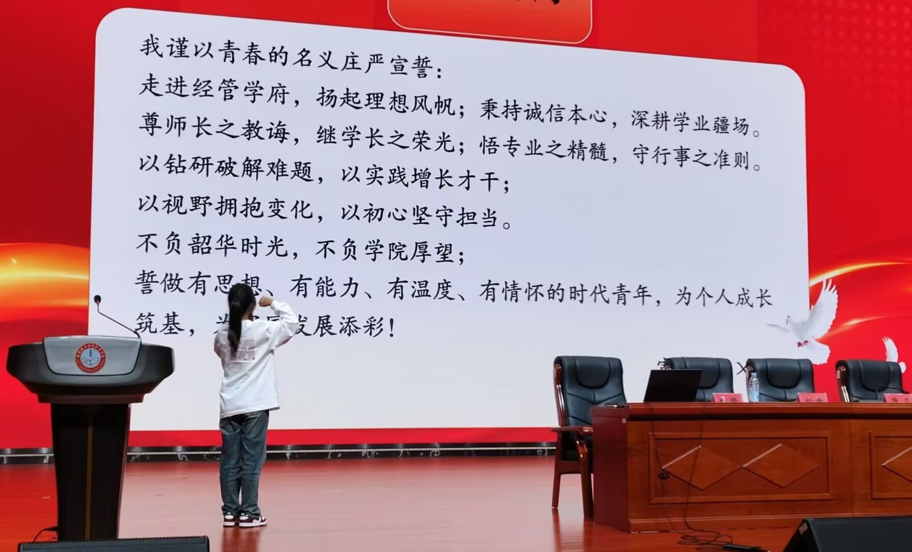 “请学院放心,请学长学姐放心!我们必将传承经贸精神,书写青春答卷!”25级新生代表于芯雨表示,将在技能锤炼中练就报国本领,接过前辈们的拼搏接力棒,让青春在矢志奋斗中绽放光彩,其昂扬的姿态赢得全场热烈掌声。