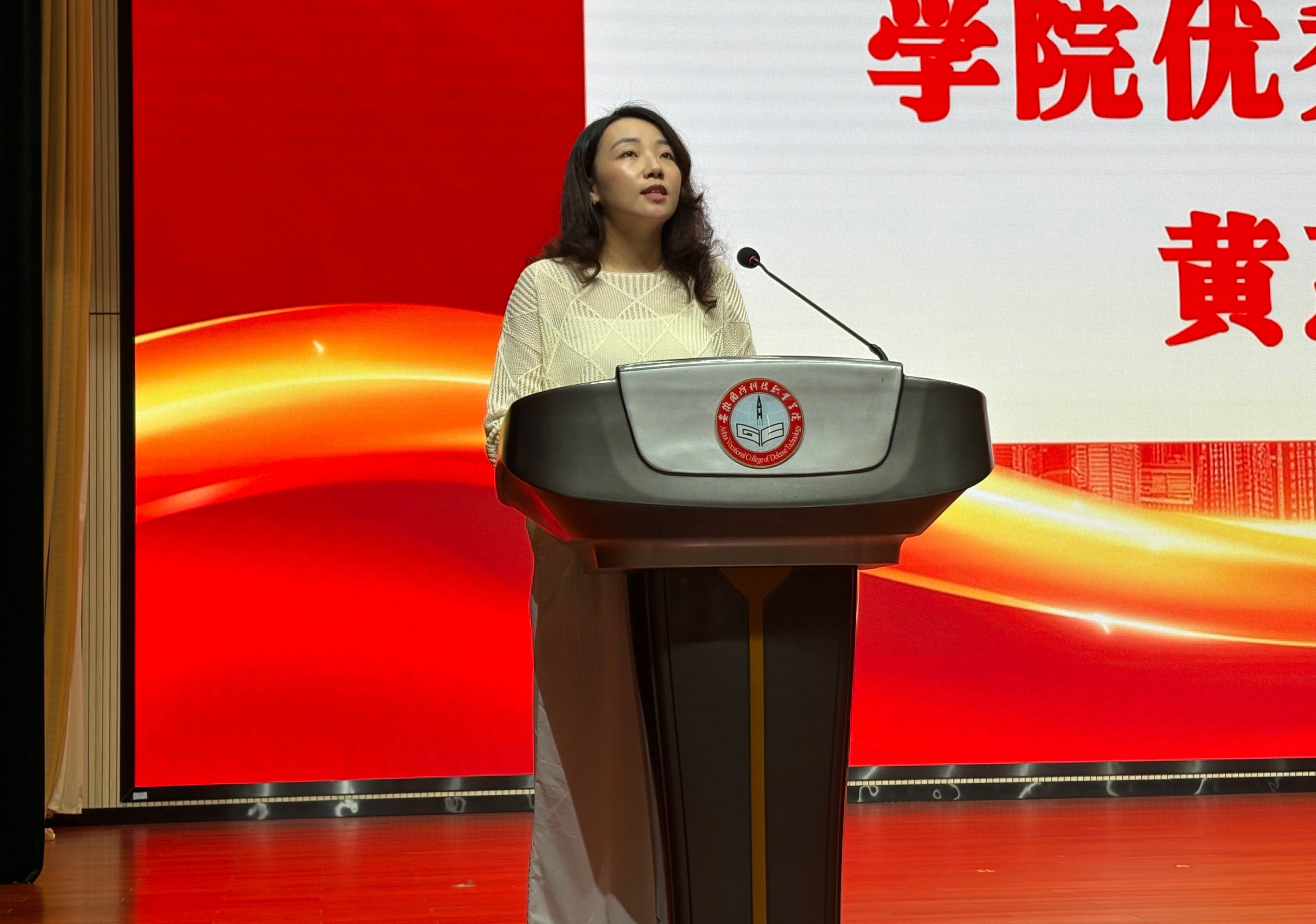 优秀教师代表黄惠在发言中以育人初心为核心主线,结合自身多年教学与育人经历,向新生们传递了深耕学业、践行实践的治学理念。她表示,教师团队将以专业的学识、热忱的态度为学子们保驾护航,既是传道授业的引路人,也是成长路上的同行者,鼓励新生们在探索中求真知,在实践中长本领,与学院共成长。